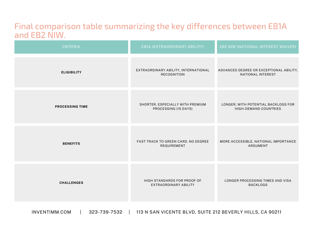 - Both EB1A and EB2 NIW are powerful pathways to permanent residency, but the right choice depends on your qualifications and professional background.