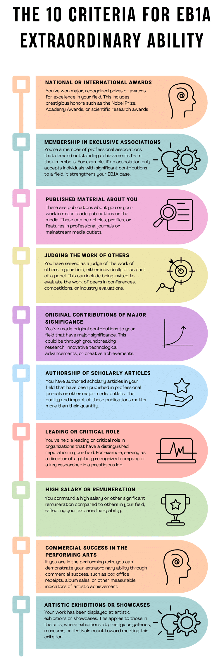 To qualify for EB1A, applicants must meet at least 3 out of 10 specific criteria, some of which include (but are not limited to):