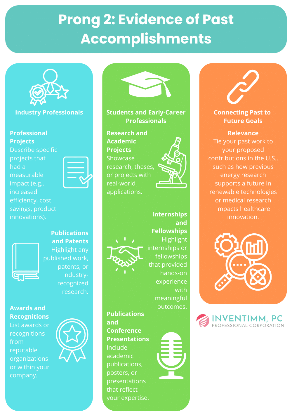 By detailing these achievements, Alex shows that he’s an established expert whose skills have had a positive impact within his organization. His professional accomplishments—supported by concrete metrics and evidence like publications and patents—help fulfill the Past Accomplishments aspect of Prong 2.