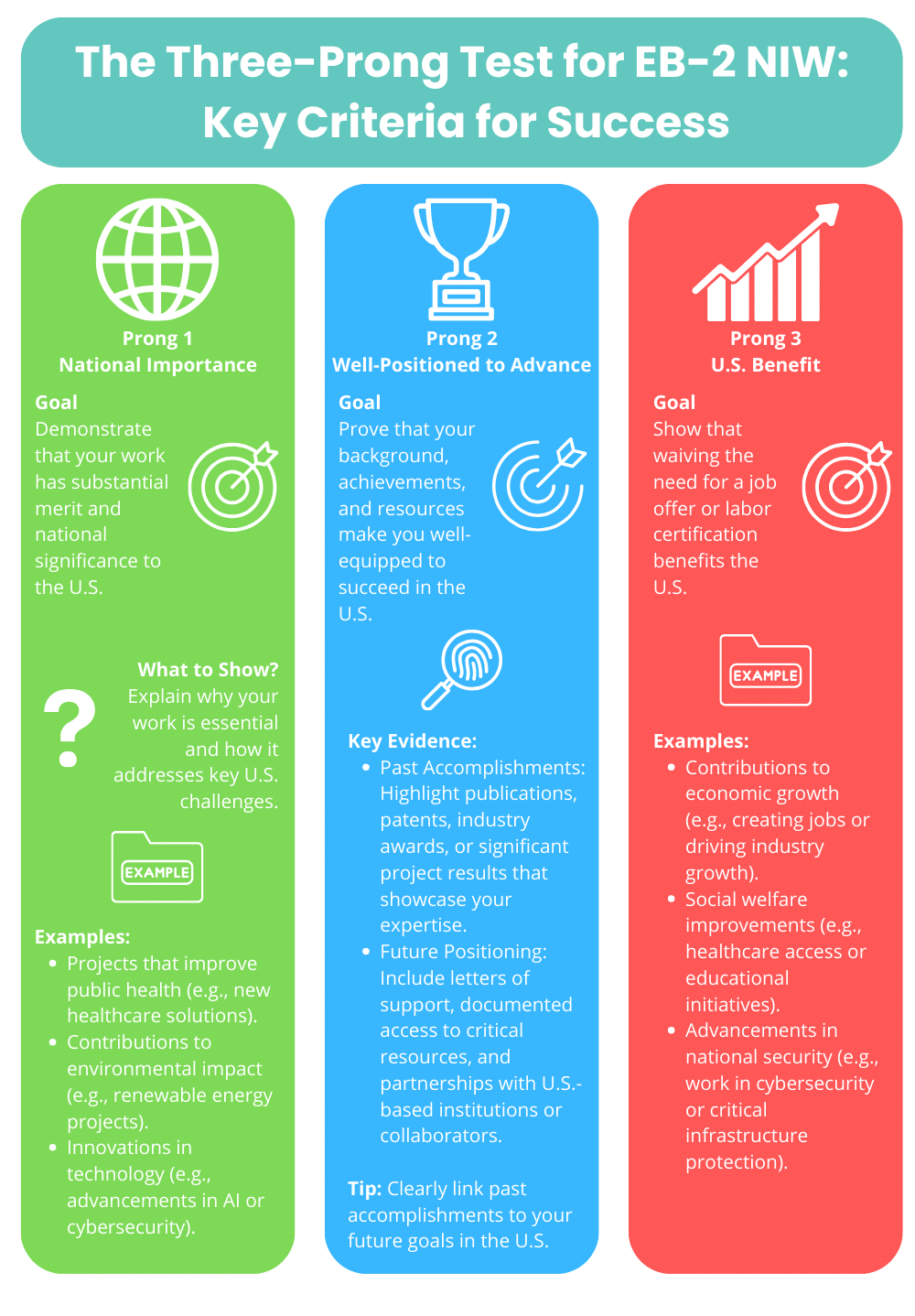 To meet Prong 2, you’ll need to provide concrete proof of both past accomplishments (i.e., the expertise and achievements that qualify you) and future positioning (i.e., the support, resources, or network that allows you to succeed in the U.S.). While this might sound daunting, remember that Prong 2 is essentially about telling your story in a way that highlights your readiness to contribute to U.S. industries or society.