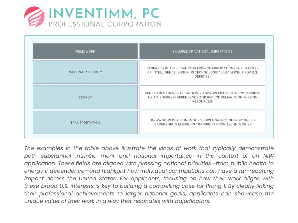 In this guide, we’ll focus on Prong 1: proving that your work has “substantial intrinsic merit” and “national importance.” This prong is foundational, as it answers the critical question: “Why does this work matter to the United States?” Addressing this question well requires aligning your professional goals with national priorities and backing them with concrete evidence.