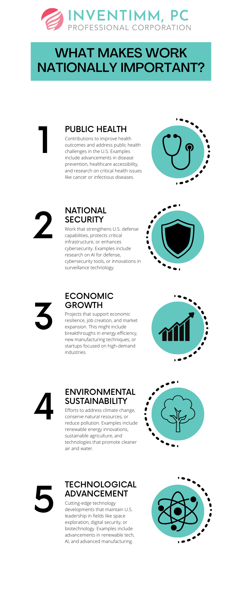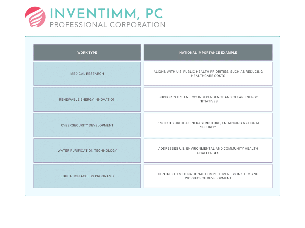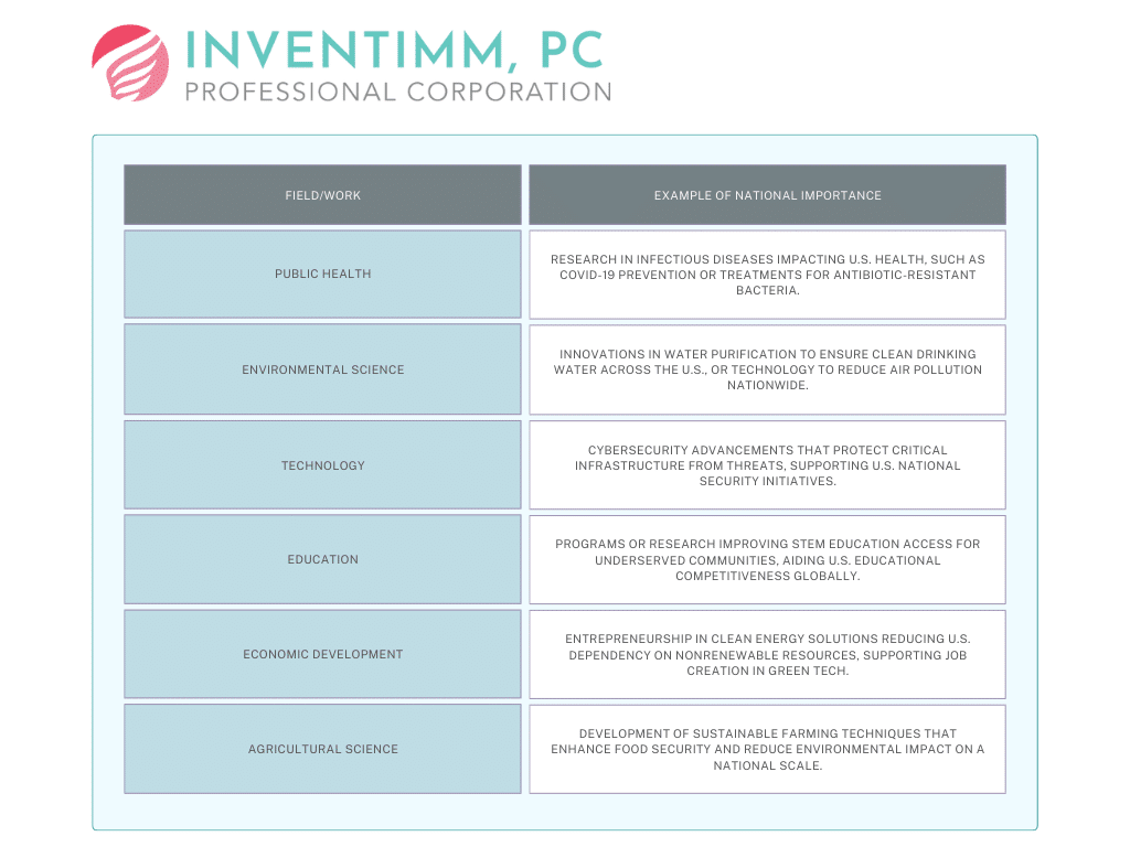 For instance, if your work directly supports U.S. government initiatives or addresses a national concern like public health, national security, or economic stability, you’re likely on the right track. A software engineer creating cybersecurity solutions that protect critical infrastructure or an entrepreneur developing renewable energy technologies that reduce U.S. dependency on nonrenewable resources both demonstrate national importance.