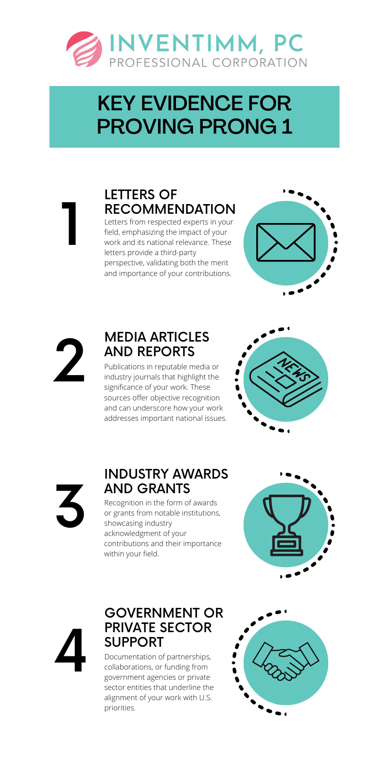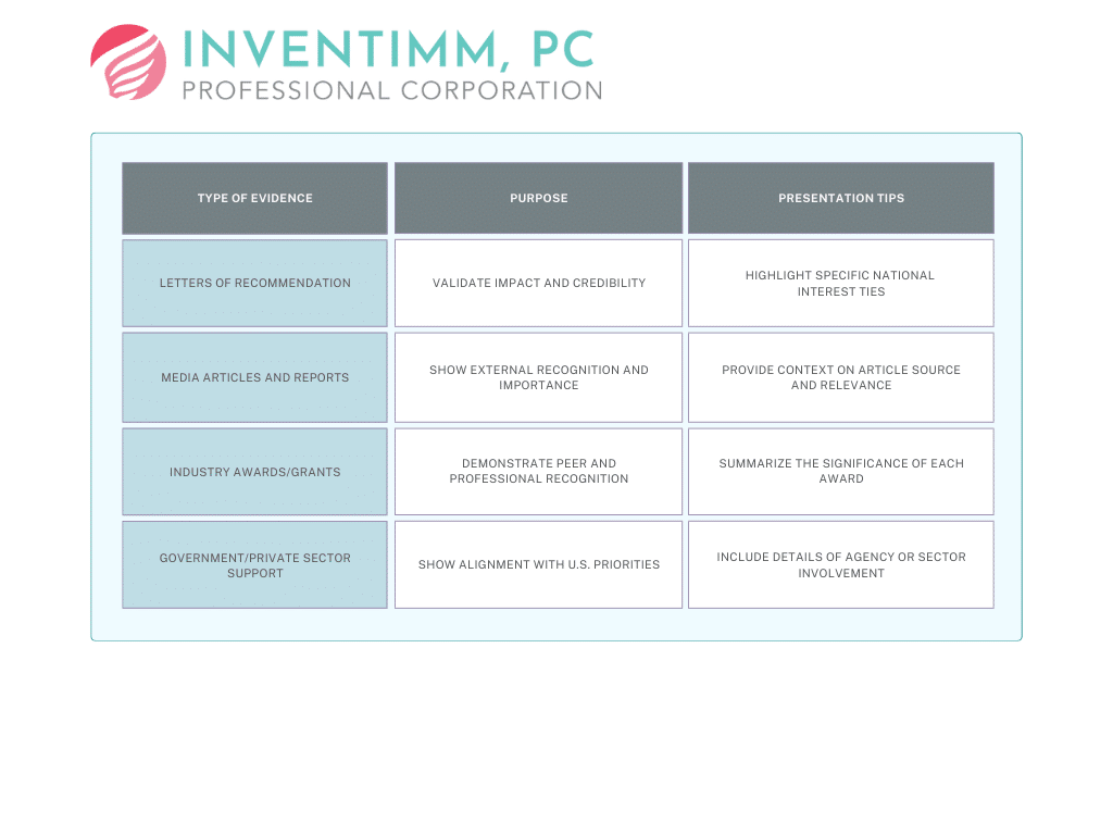 Building a strong case for Prong 1 of the NIW involves not only understanding the importance of your work but also effectively collecting and presenting the right evidence. Adjudicators rely on clear, compelling documentation to evaluate your contributions, so it’s crucial to provide organized, convincing evidence that highlights both the substantial intrinsic merit and national importance of your work. In this section, we’ll cover the types of evidence that strengthen your case and provide tips for presenting it in a way that maximizes clarity and impact.