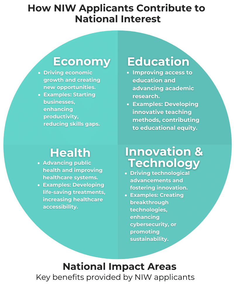 The NIW waives the standard requirement of labor certification, meaning applicants do not need to prove that no qualified U.S. workers are available for the position. Instead, the applicant must demonstrate that their proposed work has substantial merit and national importance,Diagram of How NIW Applicants Contribute to National Interest making their immigration in the interest of the United States.