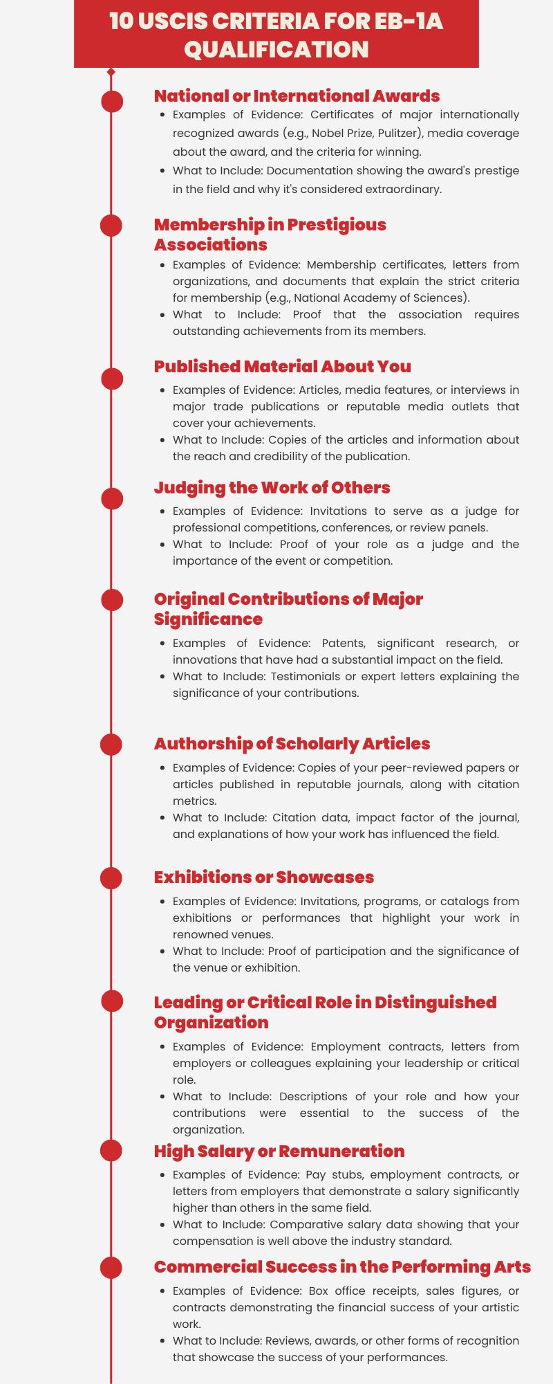 - Membership in Prestigious Organizations Documentation of membership in exclusive associations requires more than just proof of enrollment. You must show that the association demands outstanding achievements for membership. Appropriate evidence includes: