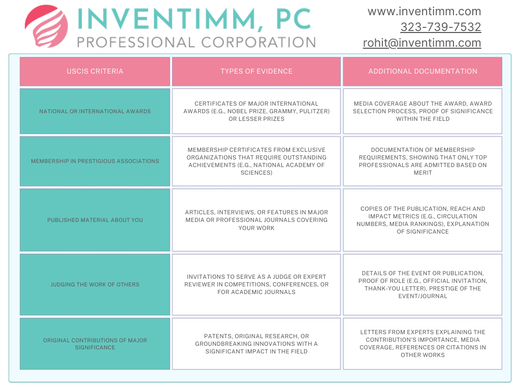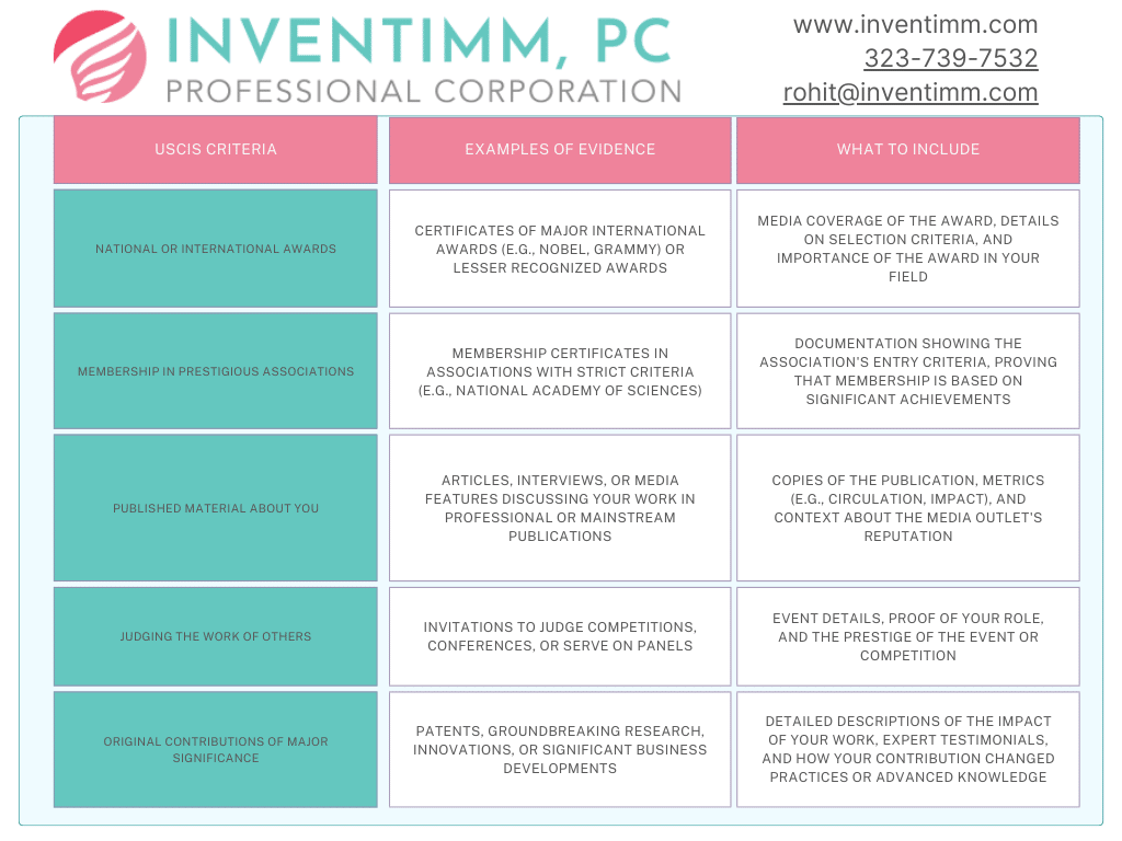 - Diversify your evidence. Make sure you’re addressing multiple USCIS criteria and providing a wide range of evidence—such as awards, media coverage, judging roles, and original contributions.